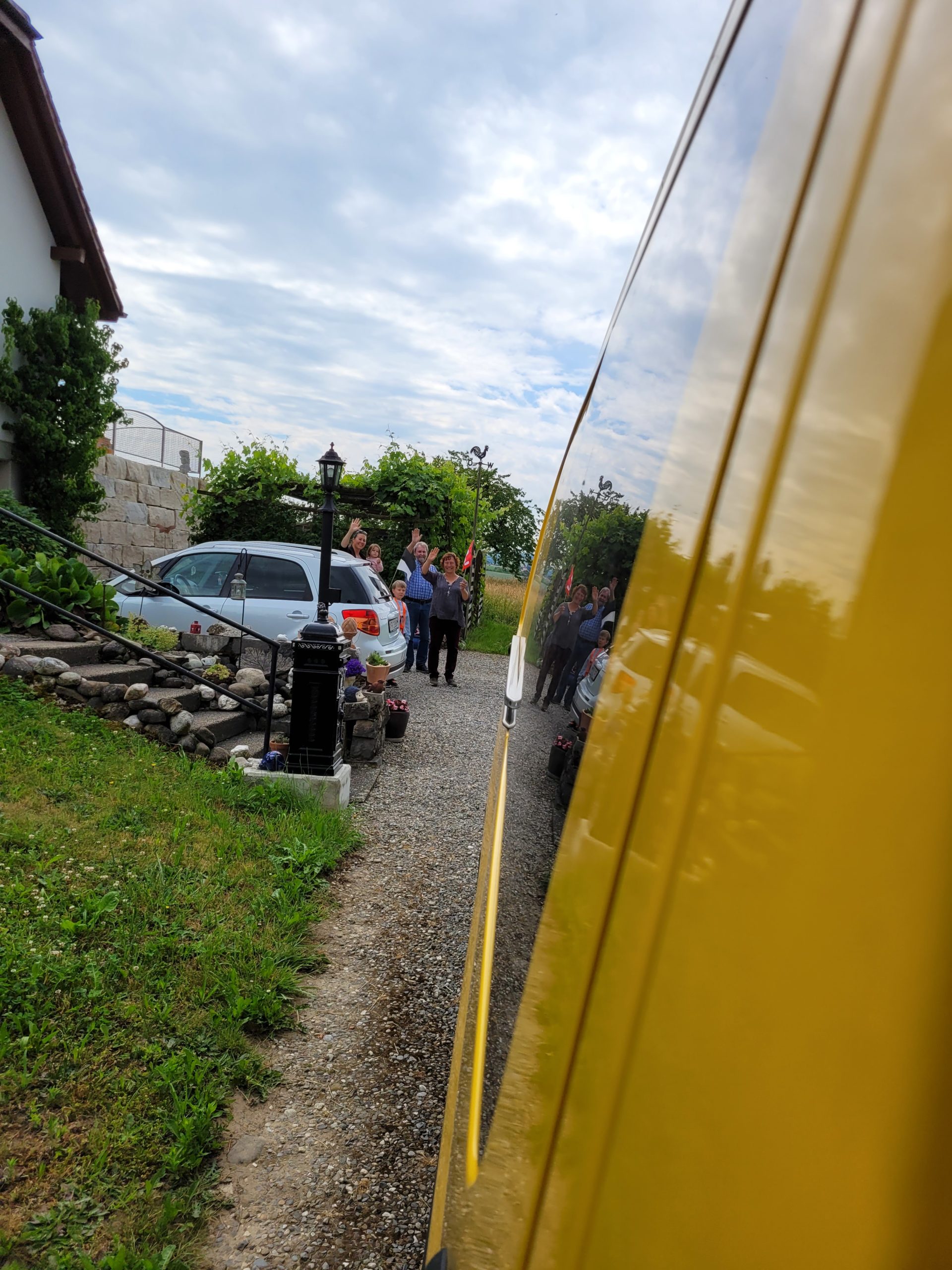 Unser Abschiedsfest fand ja bereits am 23./24. April statt, – wir freuten uns sehr über all die lieben Menschen, die nochmals Zeit mit uns verbrachten. Und eigentlich wollten wir dann bald mal los. Aber wie man an diesem Wochenende bereits sehen konnte, war der Bus noch nicht ganz fertig… so folgten noch 6 Wochen gefüllt mit intensivem Basteln, Streichen, Nähen, Sägen usw. Zwischendurch mussten wir auch noch unsere Wohnung räumen und sie unseren Nachmietern übergeben. Es ging nicht gleich in den Bus, denn wir durften uns in Rebekkas altem Kinderzimmer einrichten und wurden während der ganzen Zeit von Violette (Rebekkas Mama) vorzüglich verköstigt.